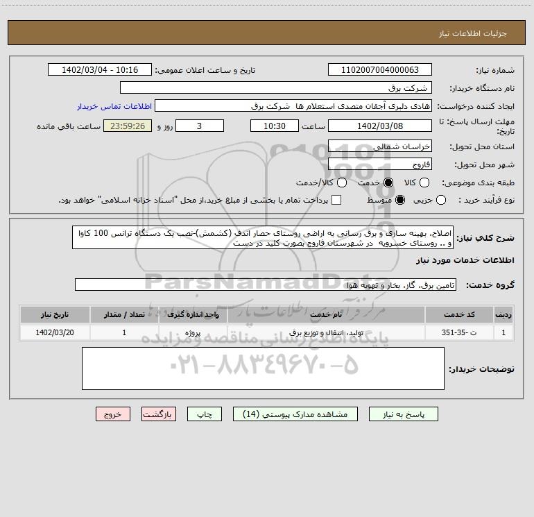 شرح کلی نیاز: اصلاح، بهینه سازی و برق رسانی به اراضی روستای حصار اندف (کشمش)-نصب یک دستگاه ترانس 100 کاوا و .. روستای خسرویه در شهرستان فاروج بصورت کلید در دست