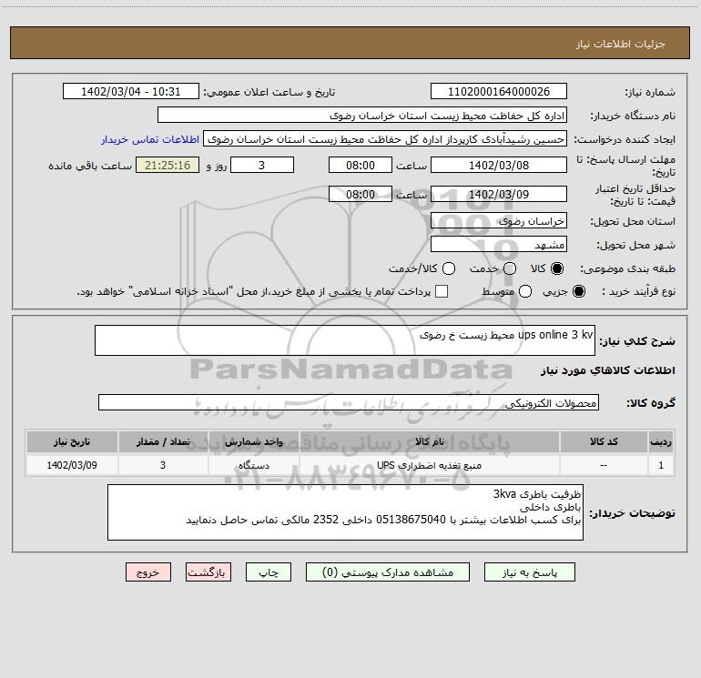 شرح کلی نیاز: ups online 3 kv محیط زیست خ رضوی