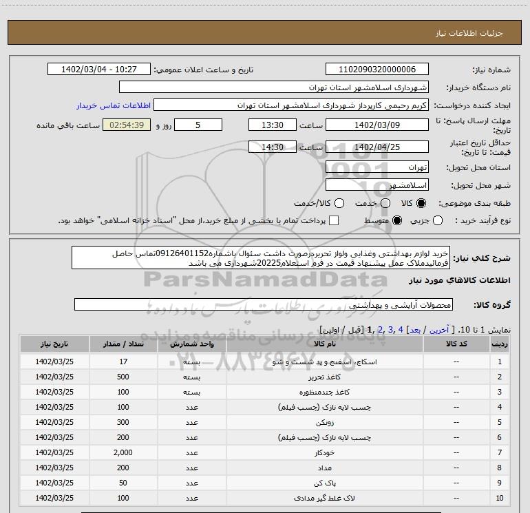 شرح کلی نیاز: خرید لوازم بهداشتی وغذایی ولواز تحریردرصورت داشت سئوال باشماره09126401152تماس حاصل فرمائیدملاک عمل پیشنهاد قیمت در فرم استعلام20225شهرداری می باشد