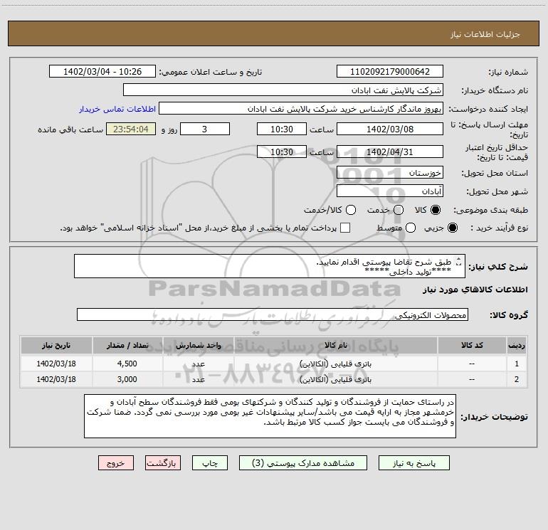 | 2 | -- | باتری قلیایی (آلکالاین) | عدد | 3,000 | 1402/03/18 |