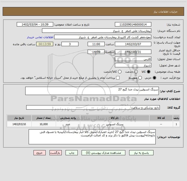 شرح کلی نیاز: سرنگ انسولین نیدل جدا گیج 27
