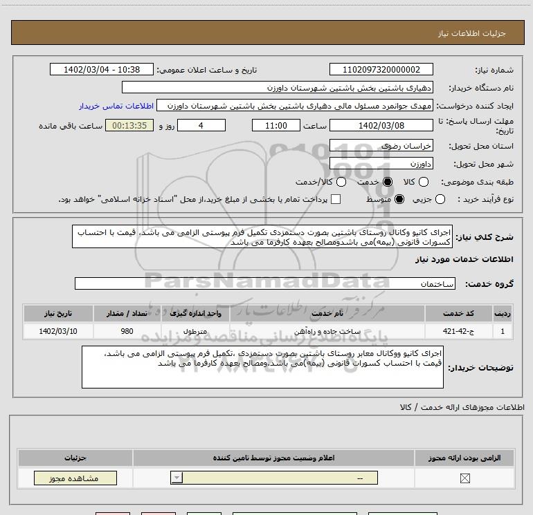 نام دستگاه خریدار:دهیاری باشتین بخش باشتین شهرستان داورزن