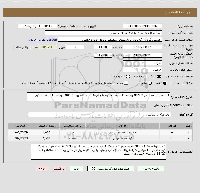 شرح کلی نیاز: کیسه زباله مشکی 83*90 وزن هر کیسه 75 گرم با چاپ-کیسه زباله زرد 83*90 وزن هر کیسه 75 گرم