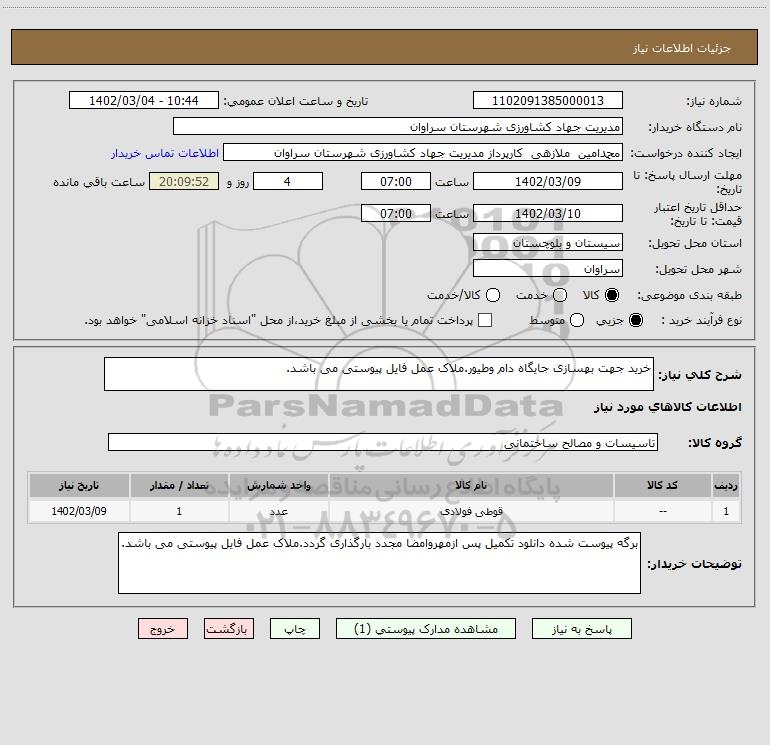 شرح کلی نیاز: خرید جهت بهسازی جایگاه دام وطیور.ملاک عمل فایل پیوستی می باشد.