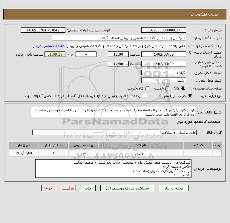 شرح کلی نیاز: قرص کلونازپام2 برای زندانهای تابعه مطابق لیست پیوستی به تفکیک زندانها تمامی اقلام درخواستی مبایست دارای تاریخ انقضا بلند مدت باشند