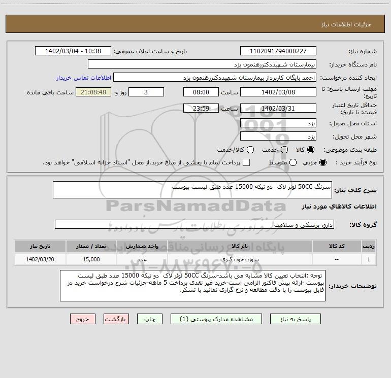 توضیحات خریدار: توجه :انتخاب تعیین کالا مشابه می باشد-سرنگ 50CC لوئر لاک دو تیکه 15000 عدد طبق لیست پیوست -ارائه پیش فاکتور الزامی است-خرید غیر نقدی پرداخت 5 ماهه-جزئیات شرح درخواست خرید در فایل پیوست را با دقت مطالعه و نرخ گزاری نمائید با تشکر.