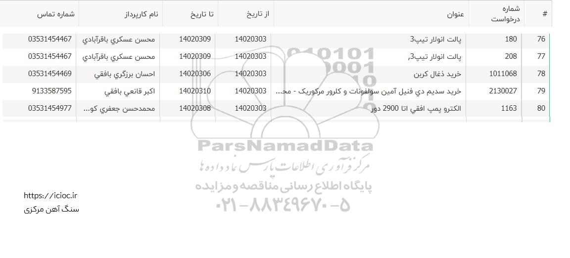| 1011068 | خرید ذغال کربن | 1402.3.3 | 1402.3.6 | احسان برزگری بافقی | 03531454469 |