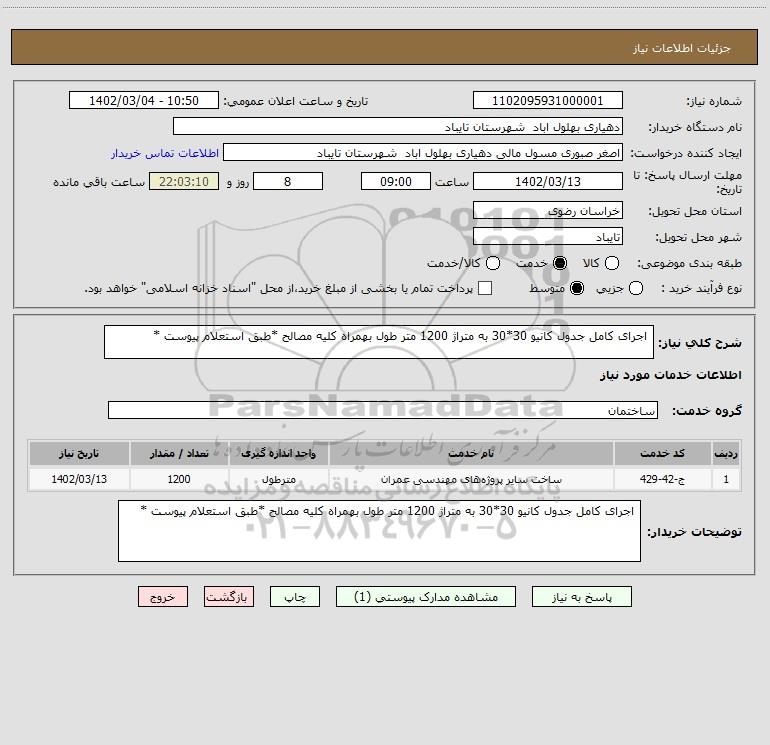 توضیحات خریدار: اجرای کامل جدول کانیو 30*30 به متراژ 1200 متر طول بهمراه کلیه مصالح *طبق استعلام پیوست *