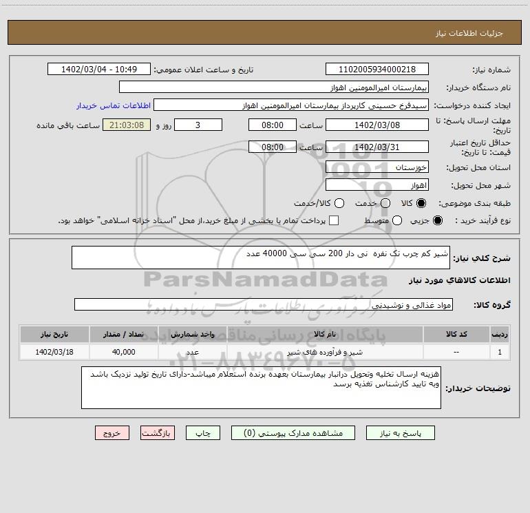 شرح کلی نیاز: شیر کم چرب تک نفره نی دار 200 سی سی 40000 عدد