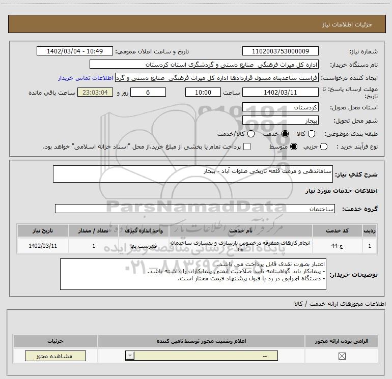 شرح کلی نیاز: ساماندهی و مرمت قلعه تاریخی صلوات آباد - بیجار