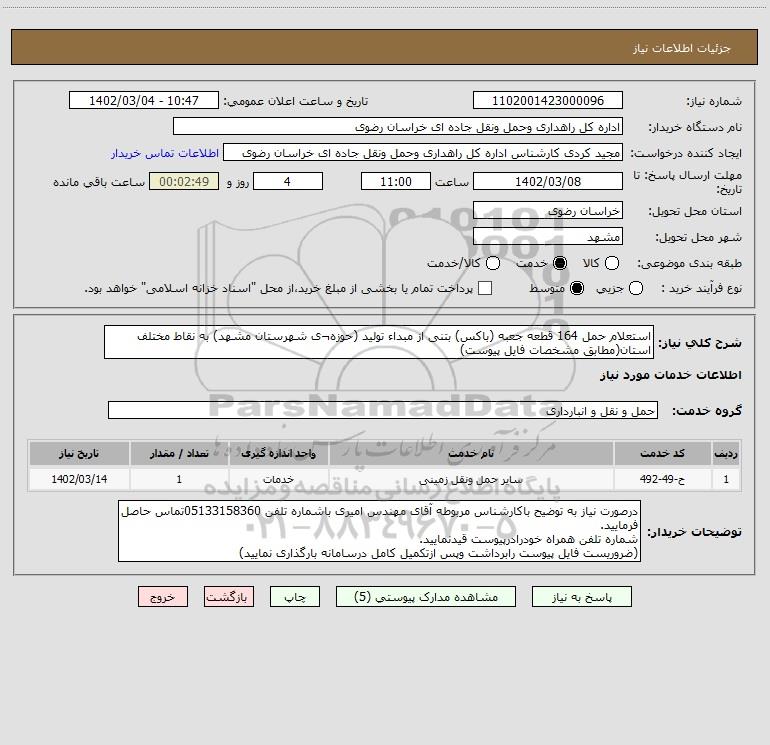 شرح کلی نیاز: استعلام حمل 164 قطعه جعبه (باکس) بتنی از مبداء تولید (حوزه¬ی شهرستان مشهد) به نقاط مختلف استان(مطابق مشخصات فایل پیوست)