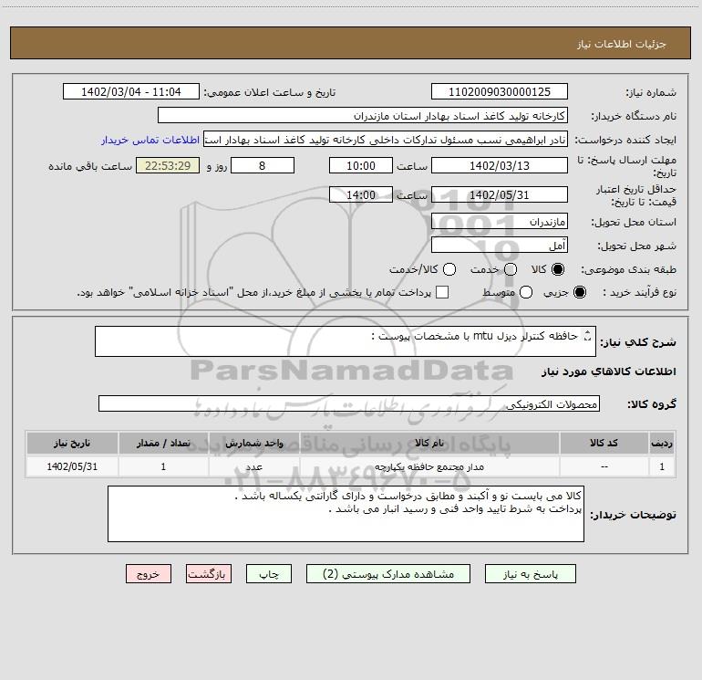 نام دستگاه خریدار:کارخانه تولید کاغذ اسناد بهادار استان مازندران