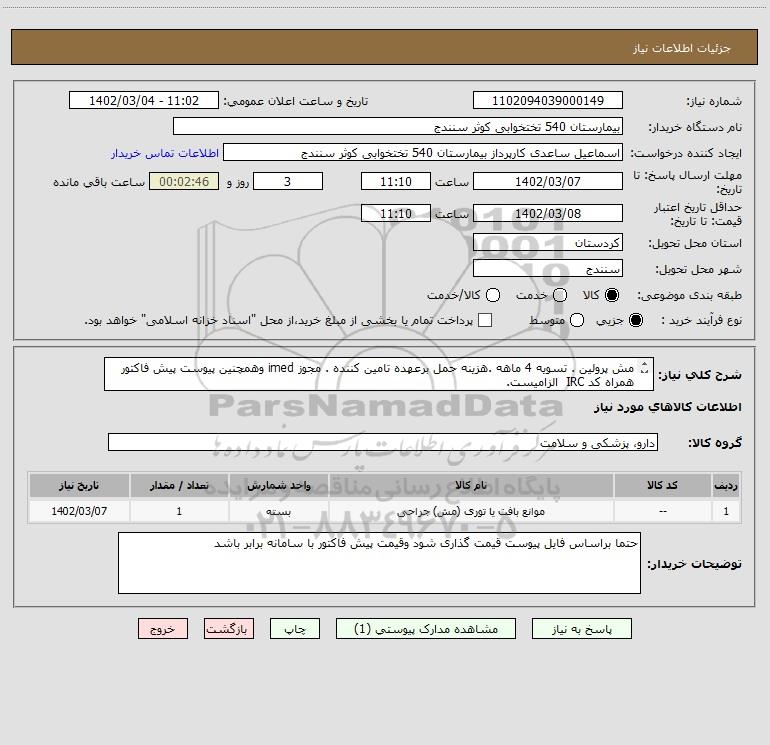 استعلام مش پرولین . تسویه 4 ماهه .هزینه حمل برعهده تامین کننده . مجوز imed وهمچنین پیوست پیش فاکتور همراه کد IRC الزامیست. لیست پیوست دارد, استعلام مش پرولین . تسویه 4 ماهه .هزینه حمل برعهده تامین کننده . مجوز imed وهمچنین پیوست پیش فاکتور همراه کد IRC الزامیست. لیست پیوست دارد
