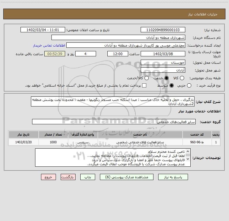 شرح کلی نیاز: بارگیری ، حمل و تخلیه خاک مناسب : مبدا اسکله جنب مسجد رنگونیها - مقصد : محدوده تحت پوشش منطقه 2شهرداری آبادان