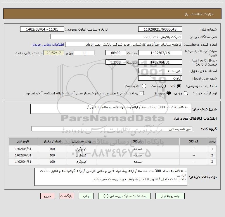 شرح کلی نیاز: سه قلم به تعداد 300 عدد تسمه / ارائه پیشنهاد فنی و مالی الزامی /