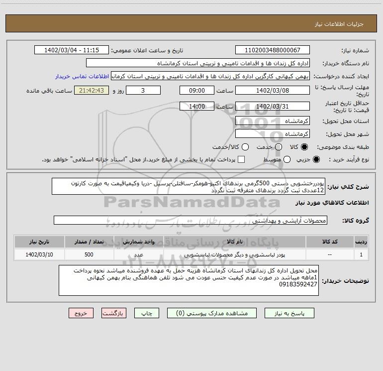 شرح کلی نیاز: پودررختشویی دستی 500گرمی برندهای اکتیو-هومکر-سافتلن-پرسیل -دریا وکیمیاقیمت به صورت کارتون 12عددی ثبت گردد برندهای متفرقه ثبت نگردد