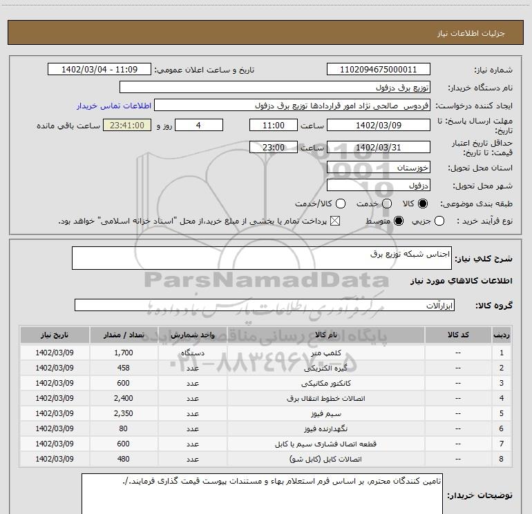 شرح کلی نیاز: اجناس شبکه توزیع برق