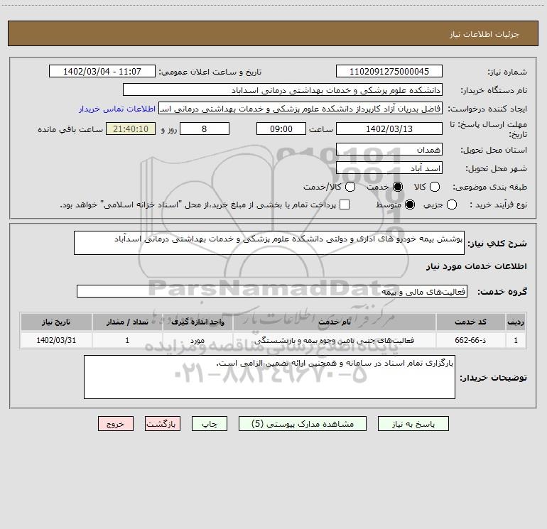 شرح کلی نیاز: پوشش بیمه خودرو های اداری و دولتی دانشکده علوم پزشکی و خدمات بهداشتی درمانی اسدآباد