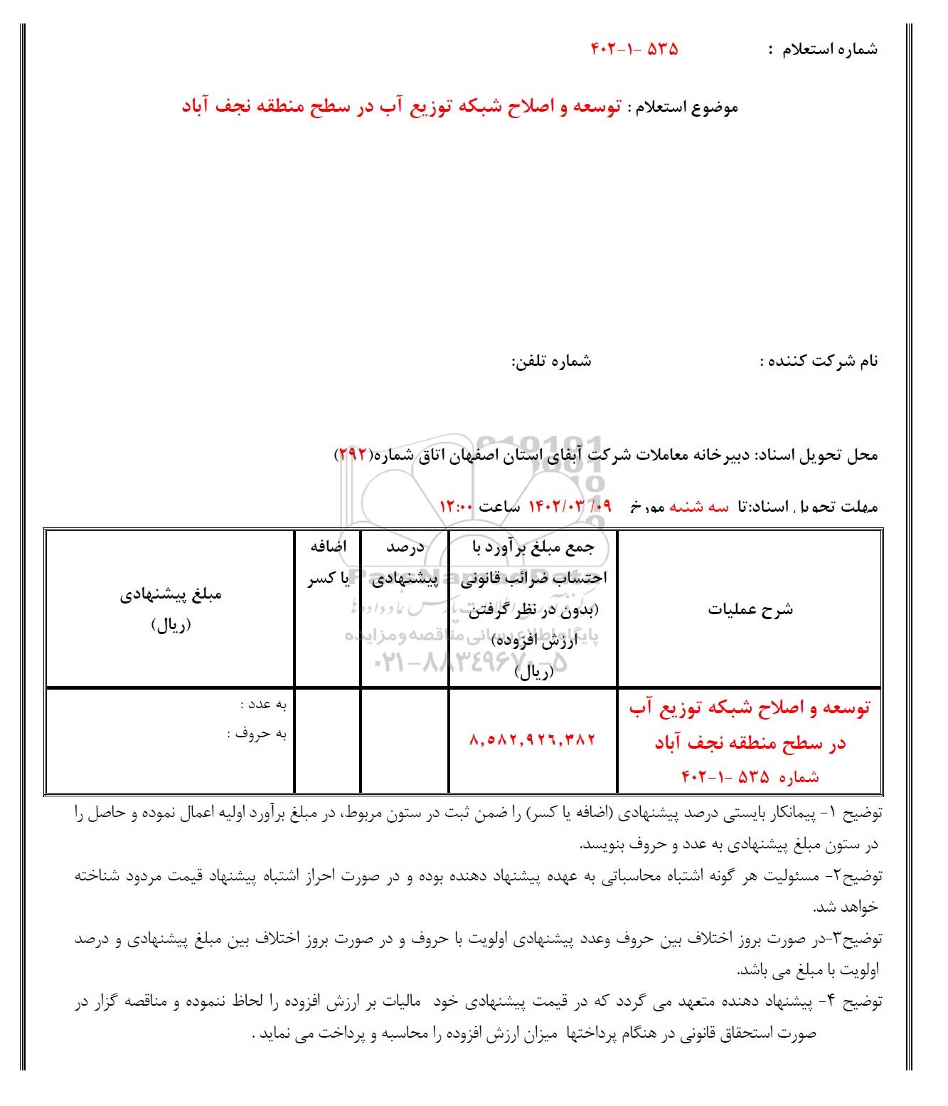 | توسعه و اصلاح شبکه توزیع آب در سطح منطقه نجف آباد شماره 535- 1 - 402 | 8.582.926.382 | به عدد: به حروف: |