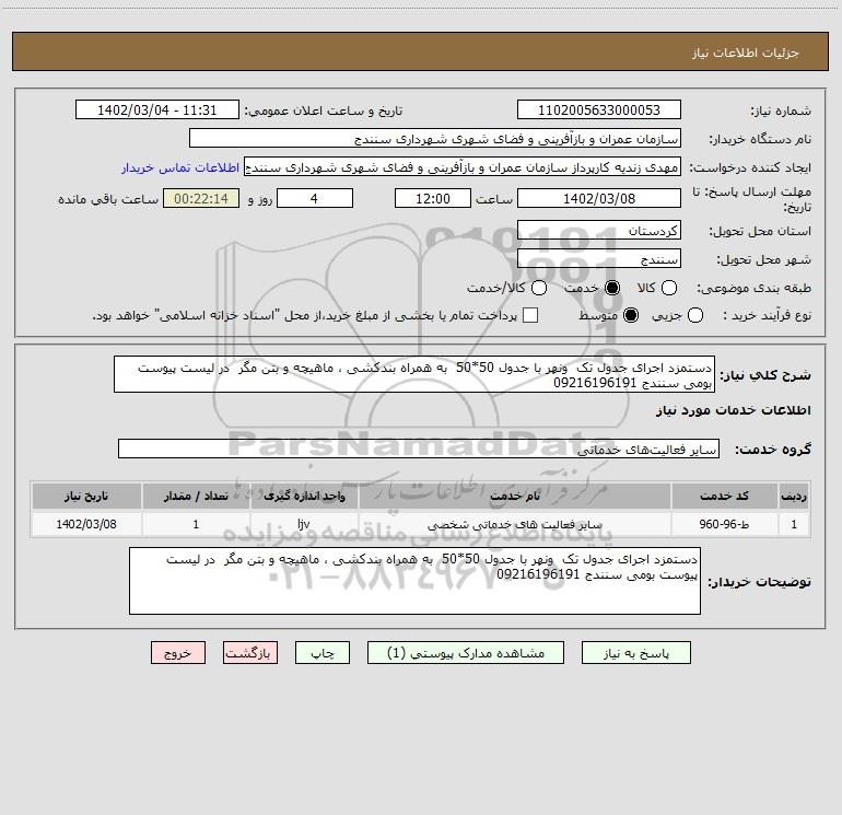 توضیحات خریدار:دستمزد اجرای جدول تک ونهر با جدول 50*50 به همراه بندکشی ، ماهیچه و بتن مگر در لیست پیوست بومی سنندج 09216196191