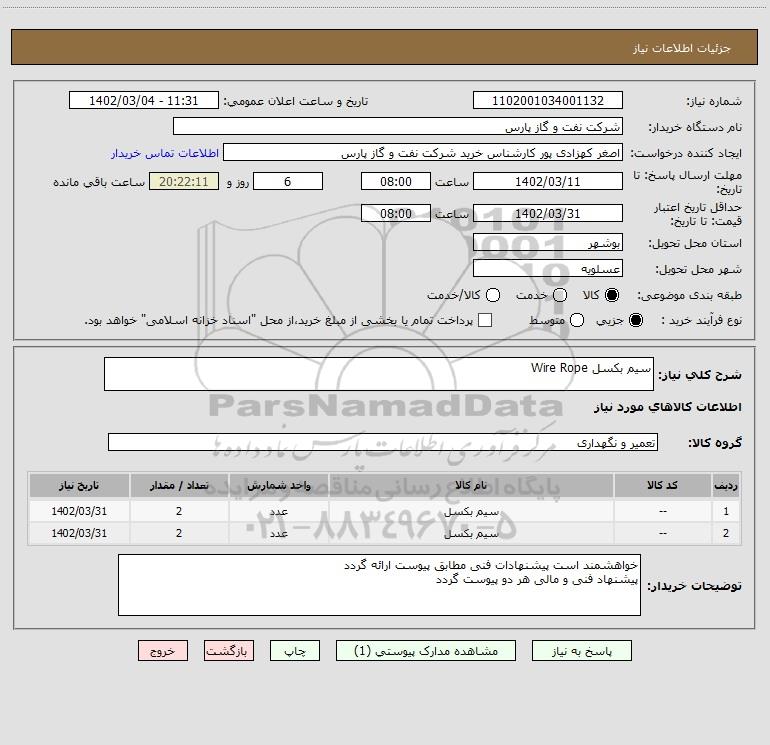 شرح کلی نیاز: سیم بکسل Wire Rope