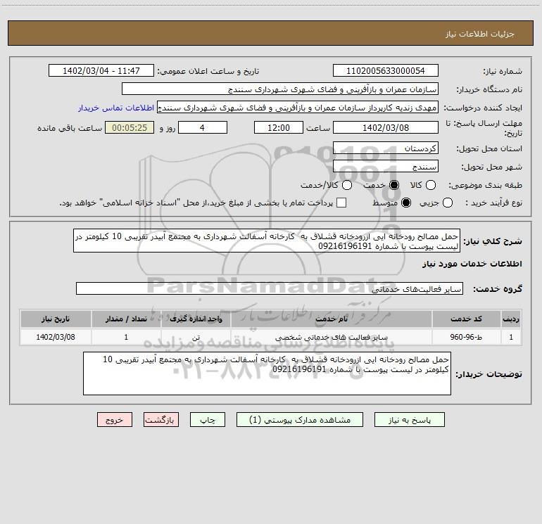 شرح کلی نیاز: حمل مصالح رودخانه ایی ازرودخانه قشلاق به کارخانه آسفالت شهرداری به مجتمع آبیدر تقریبی 10 کیلومتر در لیست پیوست با شماره 09216196191