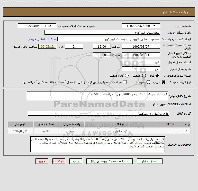 شرح کلی نیاز: کیسه ادراربزرگسال شیر دار 2000سی سی/تعداد 5000عدد