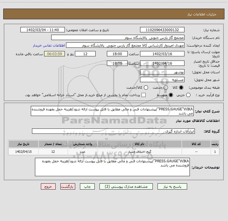 شرح کلی نیاز: PRESS.GAUGE"WIKA"/پیشنهادات فنی و مالی مطابق با فایل پیوست ارائه شود/هزینه حمل بعهده فروشنده می باشد