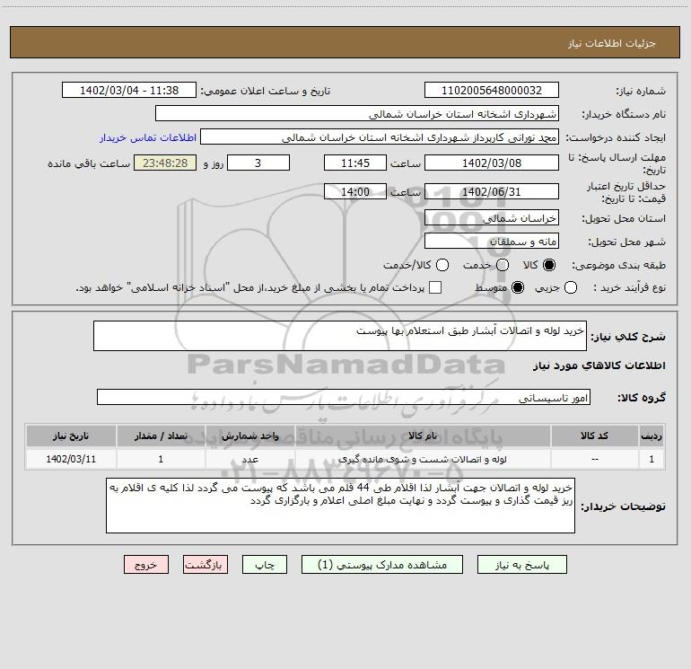 نام دستگاه خریدار:شهرداری اشخانه استان خراسان شمالی