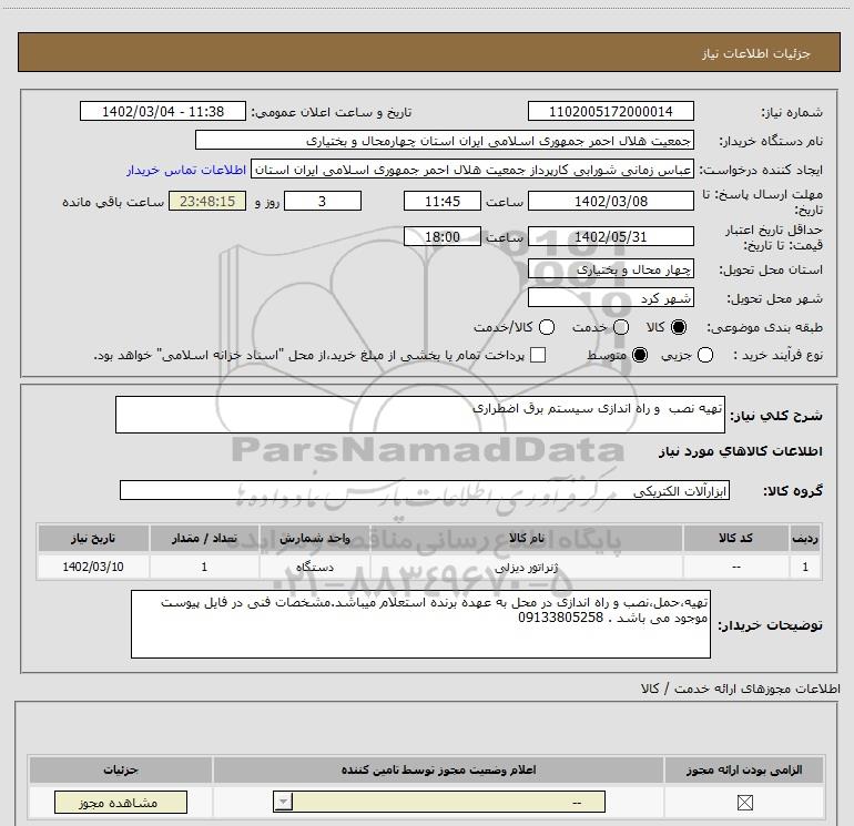 شرح کلی نیاز: تهیه نصب و راه اندازی سیستم برق اضطراری