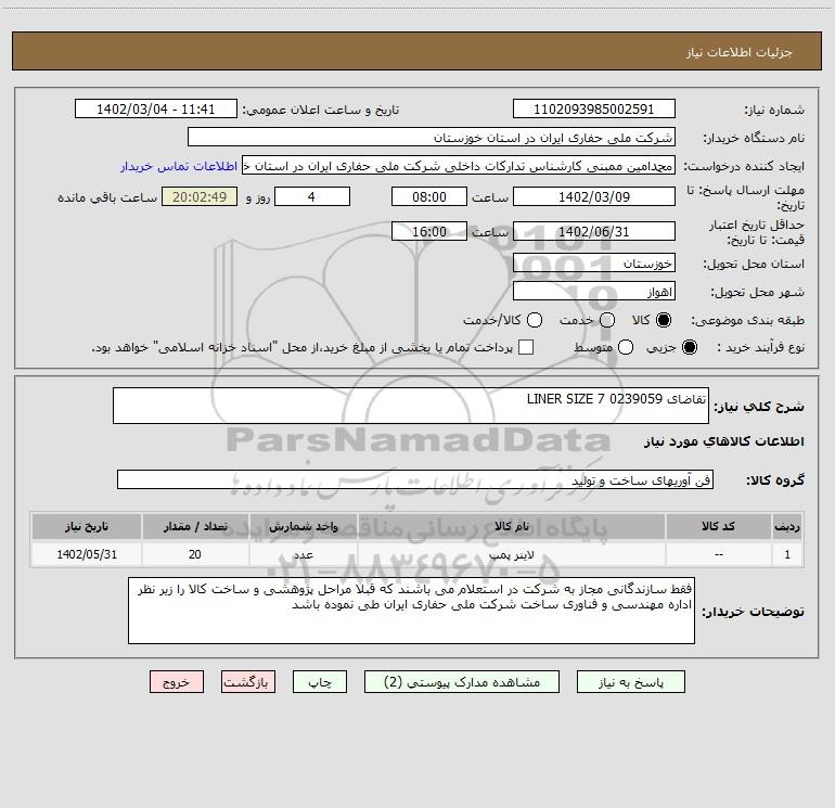 شرح کلی نیاز: تقاضای 0239059 LINER SIZE 7