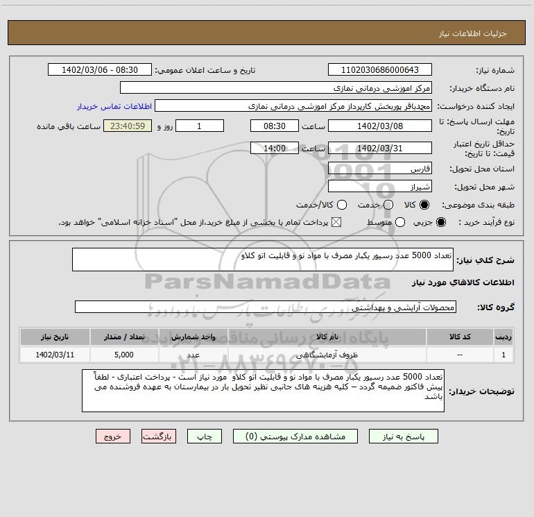 توضیحات خریدار:تعداد 5000 عدد رسیور یکبار مصرف با مواد نو و قابلیت اتو کلاو مورد نیاز است - پرداخت اعتباری - لطفاً پیش فاکتور ضمیمه گردد – کلیه هزینه های جانبی نظیر تحویل بار در بیمارستان به عهده فروشنده می باشد