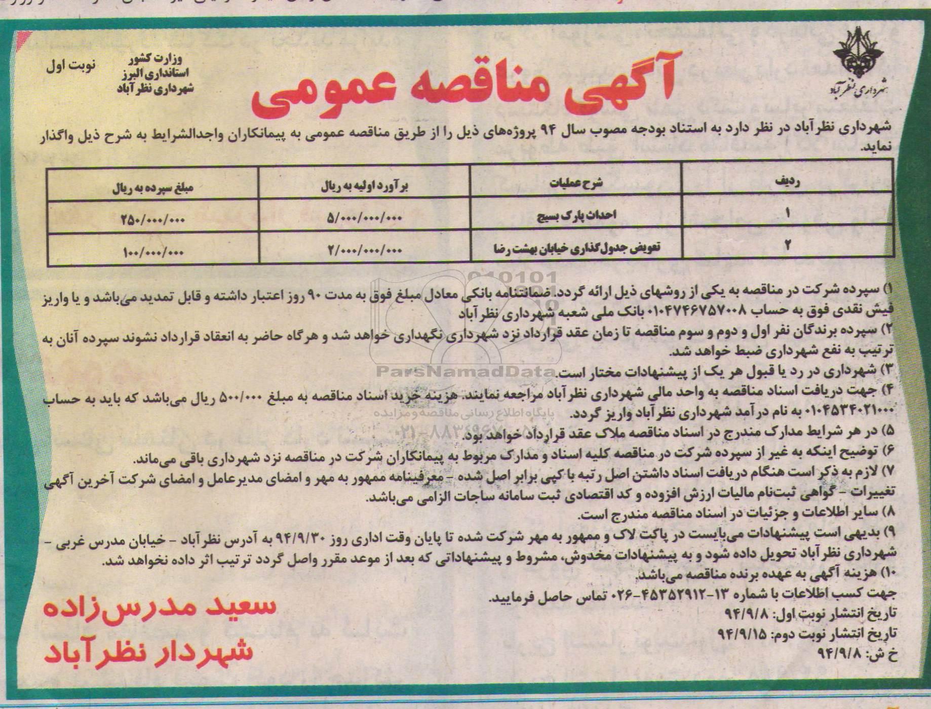 شهرداری نظرآباد در نظر دارد به استناد بودجه مصوب سال 94 پروژه های ذیل را از طریق مناقصه عمومی به پیمانکاران واجدالشرایط به شرح ذیل واگذار نماید.