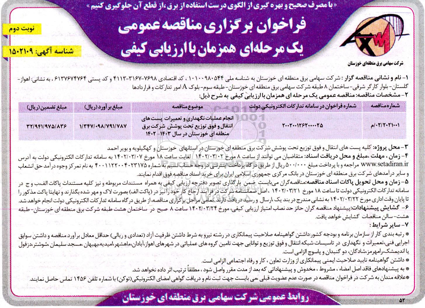 2021001/ 02 ./م 2002001262000025 انجام عملیات نگهداری و تعمیرات پست های انتقال و فوق توزیع تحت پوشش شرکت برق منطقه ای خوزستان در سال 1403 - 1402 1.347.098.791.787 32.941.975.836