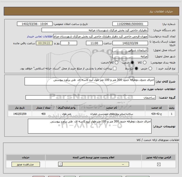 شرح کلی نیاز: اجرای جدول دوطرفه حدود 300 متر و 100 متر طول آبرو کاسه ای طی برآورد پیوستی