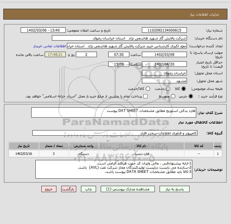 نام دستگاه خریدار:شرکت پالایش گاز شهید هاشمی نژاد استان خراسان رضوی