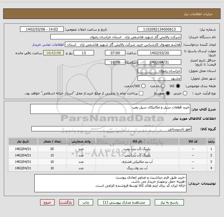 استعلام خرید قطعات سیل و مکانیکال سیل پمپ, استعلام خرید قطعات سیل و مکانیکال سیل پمپ