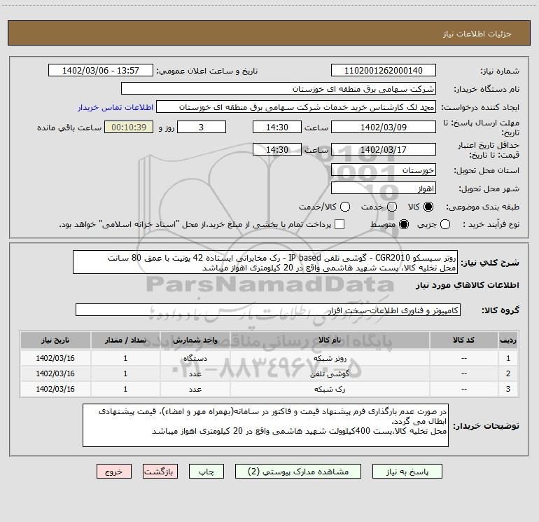 شرح کلی نیاز: روتر سیسکو CGR2010 - گوشی تلفن IP based - رک مخابراتی ایستاده 42 یونیت با عمق 80 سانت محل تخلیه کالا، پست شهید هاشمی واقع در 20 کیلومتری اهواز میباشد