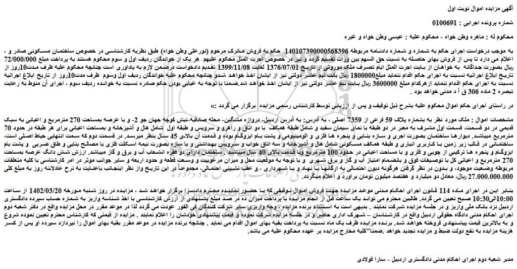 ، به موجب درخواست اجرای حکم به شماره و شماره دادنامه مربوطه 140107390000568396 حکم به فروش ماترک مرحوم (نورعلی وطن خواه) طبق نظریه کارشناسی در خصوص ساختمان مسکونی صادر و اعلام می دارد تا پس از فروش بهای حاصله به نسبت حق السهم بین وراث تقسیم گردد و نیز در خصوص اجرت المثل محکوم علیهم هر یک از خواندگان ردیف اول و سوم محکوم هستند به پرداخت مبلغ 72/000/000 ریال بصورت جداگانه به خواهان از بابت اجرت المثل ایام تصرف ملک موروثی از تاریخ 1376/07/01 لغایت 1399/11/08 تقدیم دادخواست درضمن لازم به یاداوری است چنانچه محکوم علیه ظرف مدت10روز از تاریخ ابلاغ اجرائیه نسبت به اجرای حکم اقدام ننماید مبلغ1800000 ریال بابت نیم عشر دولتی نیز از ایشان اخذ خواهد شدو چنانچه محکوم علیه خواندگان ردیف اول وسوم ظرف مدت10روز از تاریخ ابلاغ اجرائیه نسبت به اجرای حکم اقدام ننماید ازهرکدام مبلغ 3600000 ریال بابت نیم عشر دولتی نیز از ایشان اخذ خواهد شد.ضمنا با توجه به غیابی بودن حکم صادره نسبت به خوانده ردیف سوم ، اجرای آن منوط به رعایت تبصره 2 ماده 306 ق آ د مدنی خواهد بود .