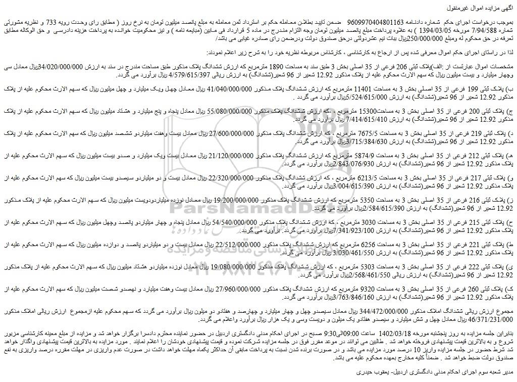 ح) پلاک ثبتی 215 فرعی از 35 اصلی بخش 3 به مساحت 3030 مترمربع ، که ارزش ششدانگ پلاک مذکور 54/540/000/000 ریال معادل پنجاه و چهار میلیاردو پانصد وچهل میلیون ریال که سهم الارث محکوم علیه از پلاک مذکور 12.92 شعیر از 96 شعیر(ششدانگ) به ارزش 7/341/923/100ریال برآورد می گردد. برآورد می گردد.