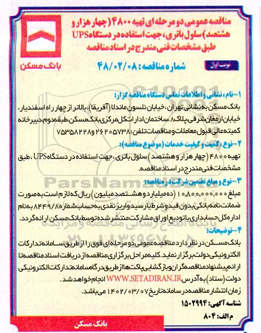 مناقصه عمومی دو مرحله ای تهیه 4800 چهار هزار هشتصد سلول باتری  جهت استفاده در دستگاه ups طبق مشخصات فنی مندرج در اسناد مناقصه