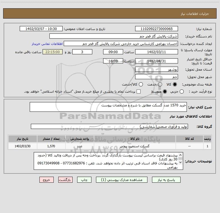شرح کلی نیاز: خرید 1570 عدد گسکت مطابق با شرح و مشخصات پیوست