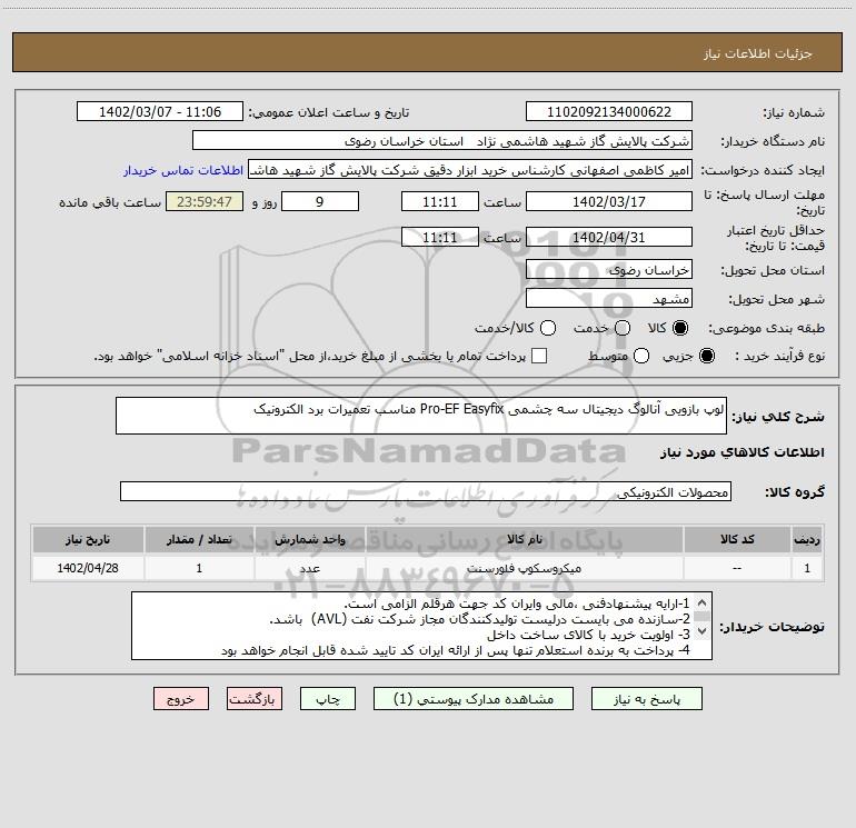 نام دستگاه خریدار:شرکت پالایش گاز شهید هاشمی نژاد استان خراسان رضوی