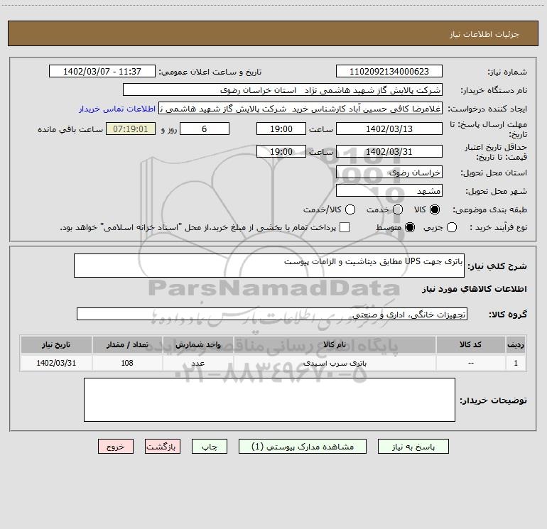 شرح کلی نیاز: باتری جهت UPS مطابق دیتاشیت و الزامات پیوست