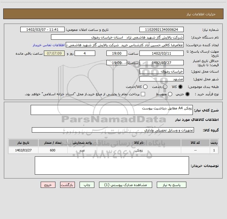 نام دستگاه خریدار:شرکت پالایش گاز شهید هاشمی نژاد استان خراسان رضوی