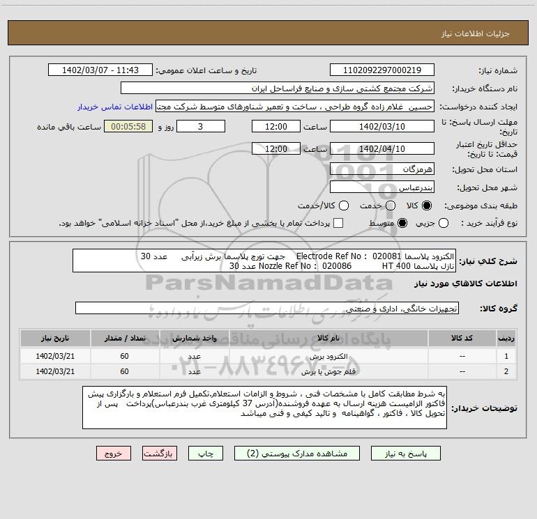 نام دستگاه خریدار:شرکت مجتمع کشتی سازی و صنایع فراساحل ایران