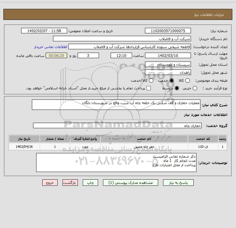 شرح کلی نیاز: عملیات حفاری و کف شکنی یک حلقه چاه آب شرب واقع در شهرستان دلگان