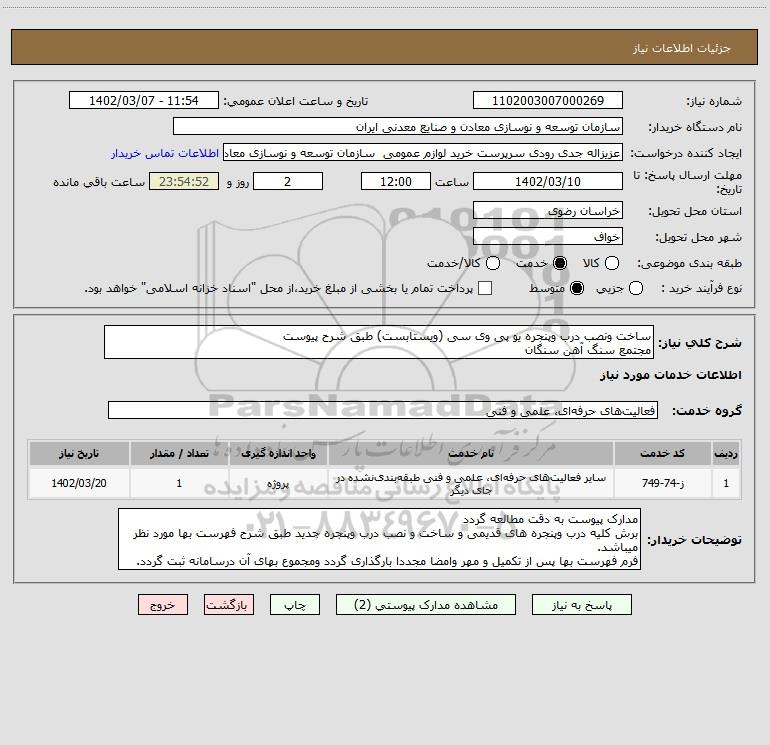 شرح کلی نیاز: ساخت ونصب درب وپنجره یو پی وی سی (ویستابست) طبق شرح پیوست