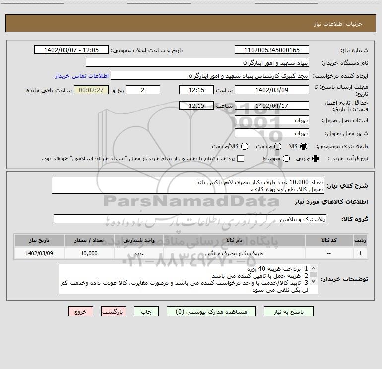 | 1 | -- | ظروف یکبار مصرف خانگی | عدد | 10,000 | 1402/03/09 |