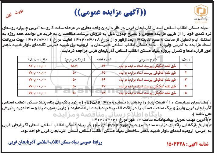 بنیاد مسکن انقلاب اسلامی استان آذربایجان غربی در نظر دارد 5 واحد تجاری در مرحله سفت کاری به آدرس چایپاره روستای قره کندی خود را از طریق مزایده عمومی و به شرح جدول ذیل به فروش برساند